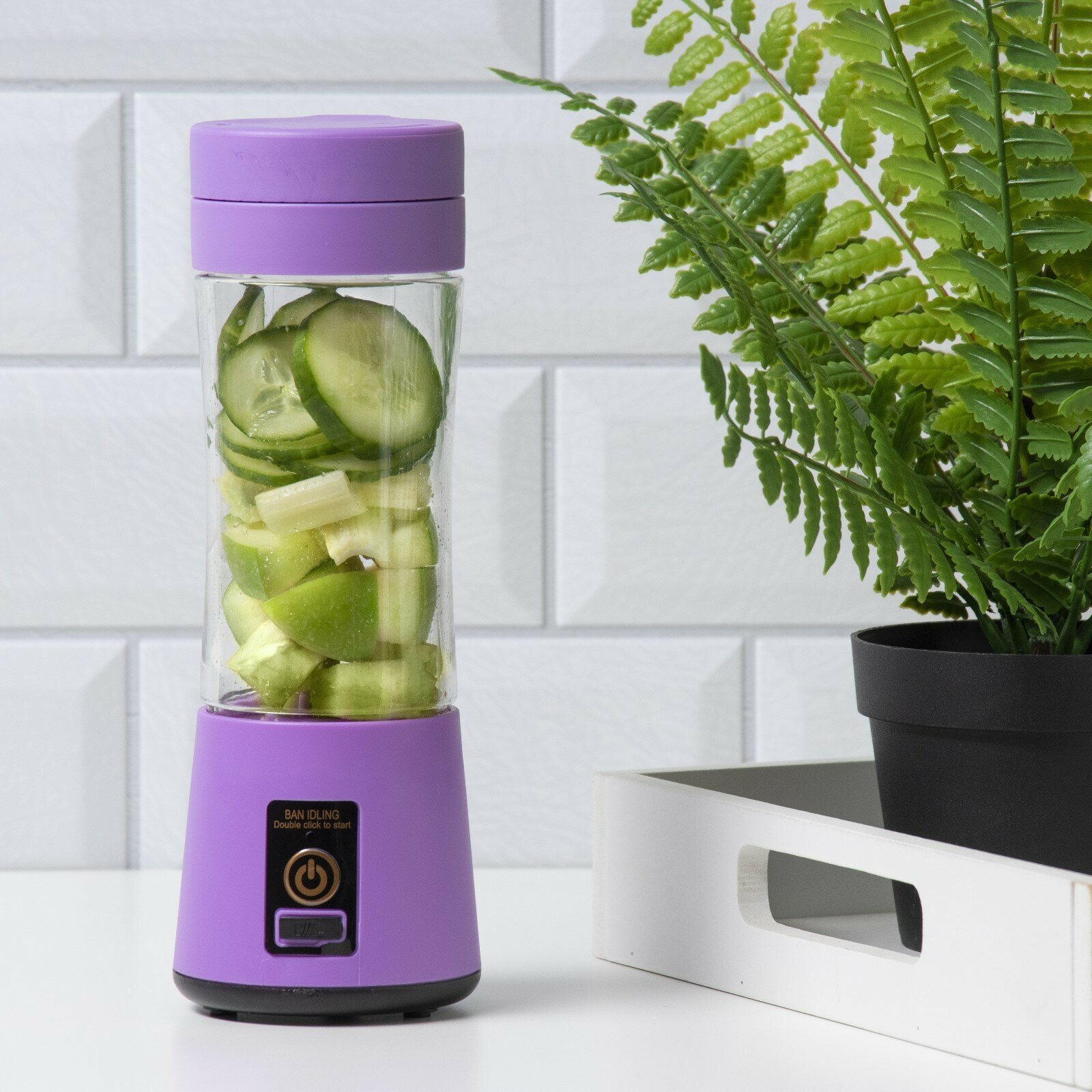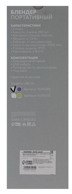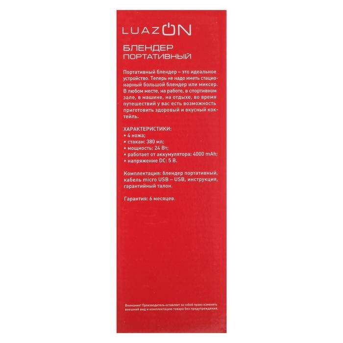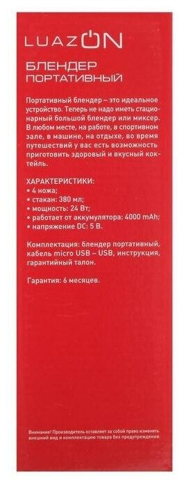 Блендер портативный 24 Вт, 380 мл С помощью блендера вы быстро измельчите, взобьёте или перемешаете необходимые продукты. Аппарат не занимает много места на кухне, имеет небольшой вес. Эргономичная ручка с не скользящим покрытием удобна в применении. Скорость вращения регулируется в зависимости от ингредиентов. Вес блендера 370 грамм. Вес в упаковке 430 грамм. В комплект входит блендер и шнур USB для зарядки. Включение: двойное нажатие на кнопку. Цвет в ассортименте.