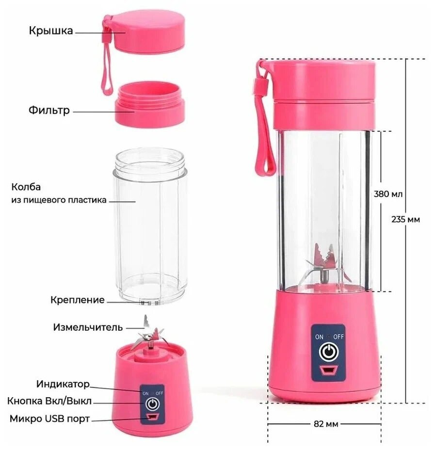 Портативный блендер для смузи - это идеальное устройство! Преимущества портативного смузи мейкера: Компактный размер. Емкий аккумулятор. Возможность приготовить свежий смузи или коктейль в любом месте. Очень удобен для приготовления энергетических коктейлей в спортзале. Легко и быстро готовить протеиновые коктейли. Можно приготовить детское питание. Крышка надёжно закрывается, жидкость никогда не прольётся. Легко моется. Защита от случайного включения. Подзарядка от любого USB устройства.